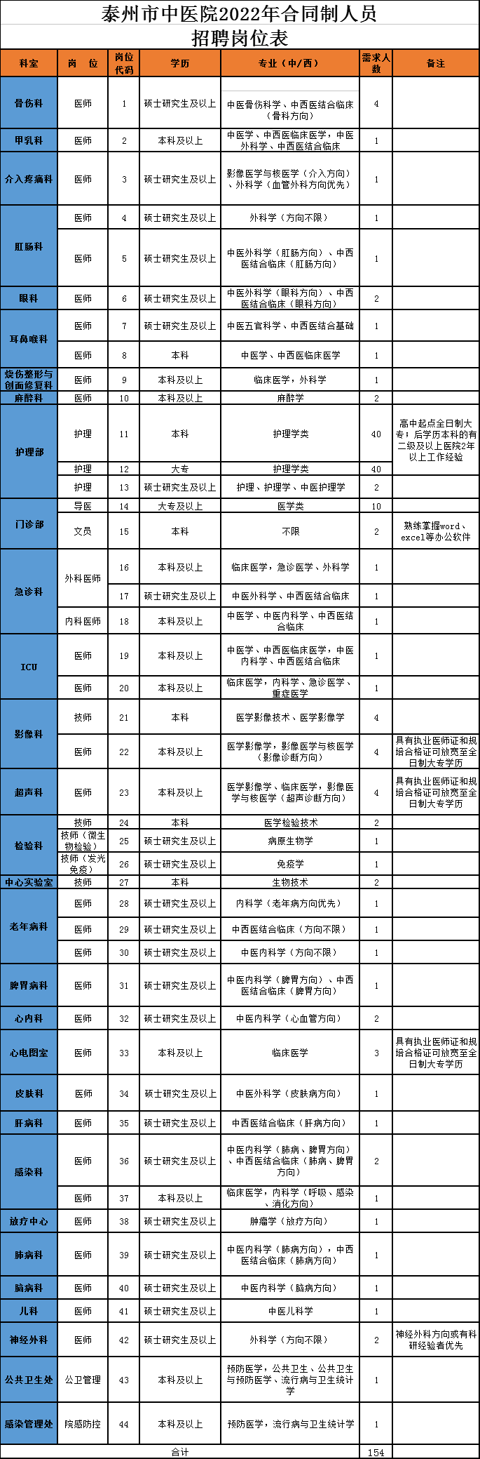 泰州市中醫(yī)院是泰州市衛(wèi)生健康委員會(huì)直屬差額撥款事業(yè)單位,2022年計(jì)劃招聘154名合同制人員,具體崗位、專業(yè)、學(xué)歷等要求詳見《泰州市中醫(yī)院2022年合同制人員招聘崗位表》(見下表)。