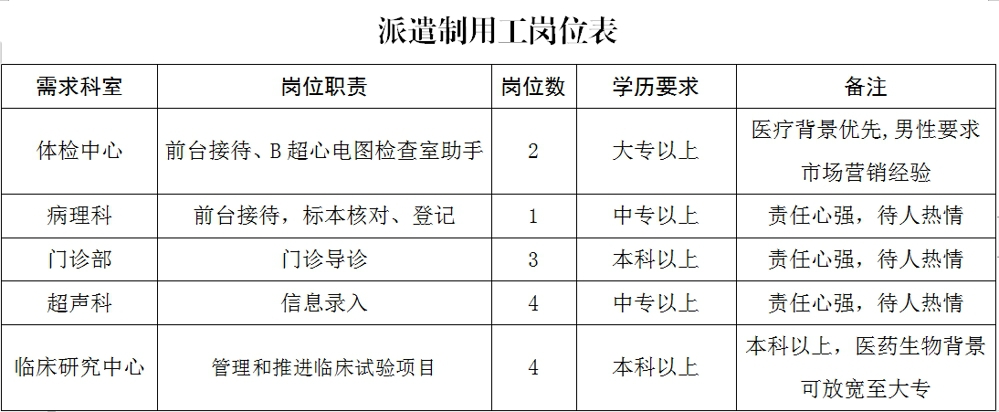 因我院業(yè)務上升,人員需求增加,現(xiàn)急需招聘體檢中心、門診部、醫(yī)療輔助科室及臨床研究項目派遣制用工14名(具體見附件“派遣制用工崗位表”,以下簡稱“崗位表”),條件要求如下: