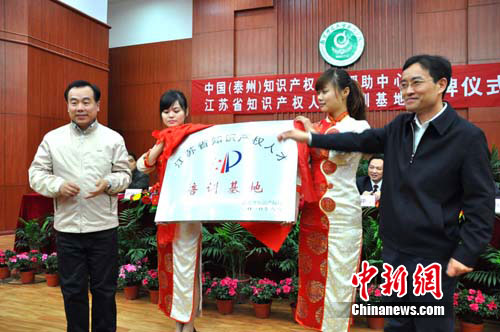 江蘇省知識(shí)產(chǎn)權(quán)局局長(zhǎng)朱宇和泰州副市長(zhǎng)廖濤為江蘇省知識(shí)產(chǎn)權(quán)人才培訓(xùn)基地揭牌。胡家棟 攝