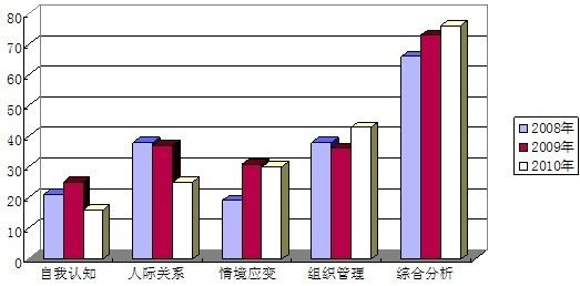 人際關(guān)系能力考察也由2009年的18%降低到2010年的13%,說明人際關(guān)系也漸漸淡出命題人視野。縱然人際關(guān)系題目比例降低,但是難度卻隨之增加,元素更加豐富,線索更加交織,以增加考生作答難度,從而形成區(qū)別度,使得更優(yōu)秀的考生能脫穎而出。